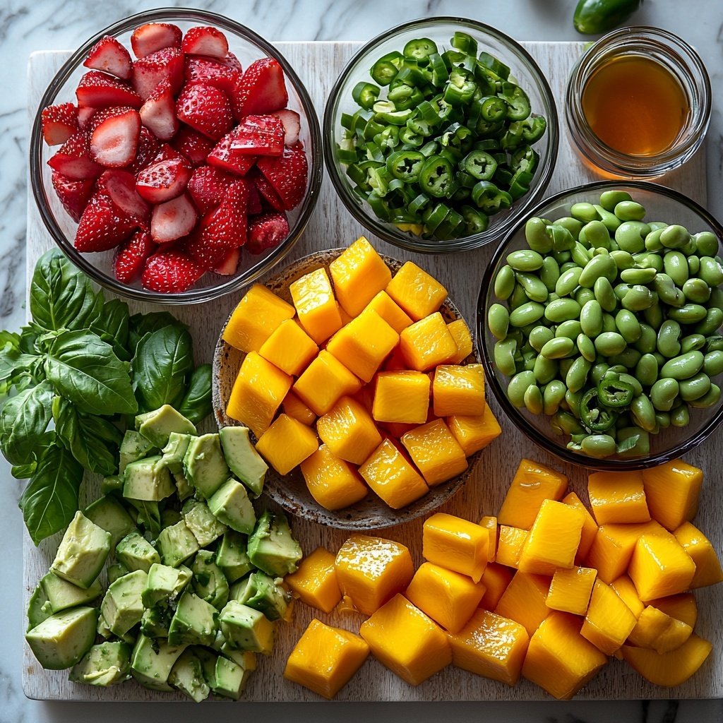 - Combine Salad Ingredients: In a large mixing bowl, add the diced mangoes, shelled edamame (if using), diced strawberries, diced avocado, finely diced red onion, seeded and finely diced jalapeño, thinly sliced basil leaves, and chopped cilantro. Gently mix until the ingredients are evenly distributed.