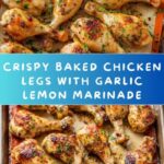 When ready to cook, preheat your oven to 400˚F and line a rimmed baking sheet with foil or a silicone mat to make cleanup easier. Arrange the chicken legs skin-side down on the prepared sheet and let them come to room temperature while the oven preheats—this helps them cook evenly. Brush any leftover marinade over the chicken for an extra burst of flavor. Bake for 25 minutes on skin-side-down to start locking in juices. Then, flip the legs over and bake for another 25 minutes with skin-side-up to get that perfectly crisp, golden skin. For an even crunchier finish, broil the chicken for 2 to 3 minutes, watching closely so it doesn’t burn. That’s it! Your Baked Chicken Legs with Garlic, Lemon, and Parsley Marinade Recipe is ready to enjoy.