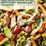 This BBQ Chicken Salad is a hearty and flavorful dish combining seasoned, skillet-cooked chicken breasts with fresh romaine lettuce, black beans, tomatoes, corn, red onion, cheese, avocado, and crunchy tortilla strips, all topped off with BBQ sauce and creamy ranch dressing for a delicious and satisfying meal perfect for lunch or dinner.