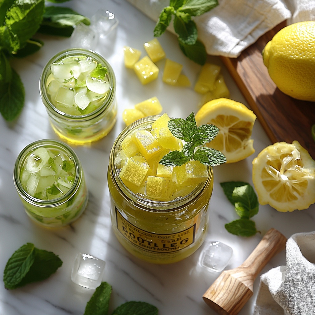 - Prepare the Bootleg Mix: Place the lemonade concentrate, limeade concentrate, and packed mint leaves into a blender. Blend until the mint is finely chopped, creating a bright, aromatic mixture. Pour the blend into a jar and refrigerate for at least 2 hours to allow the flavors to meld and develop fully. Note that during refrigeration, the chopped mint will rise to the top; before making cocktails, scoop off most of the mint for a smoother drink.