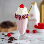 Once your glass is perfectly rimmed and chilled, pour the milkshake in generously. Then lavish it with a generous swirl of whipped cream on top and crown your creation with a bright maraschino cherry. This extra layer of sweetness and visual appeal transforms your glass into an irresistible indulgence. Cheers to that!