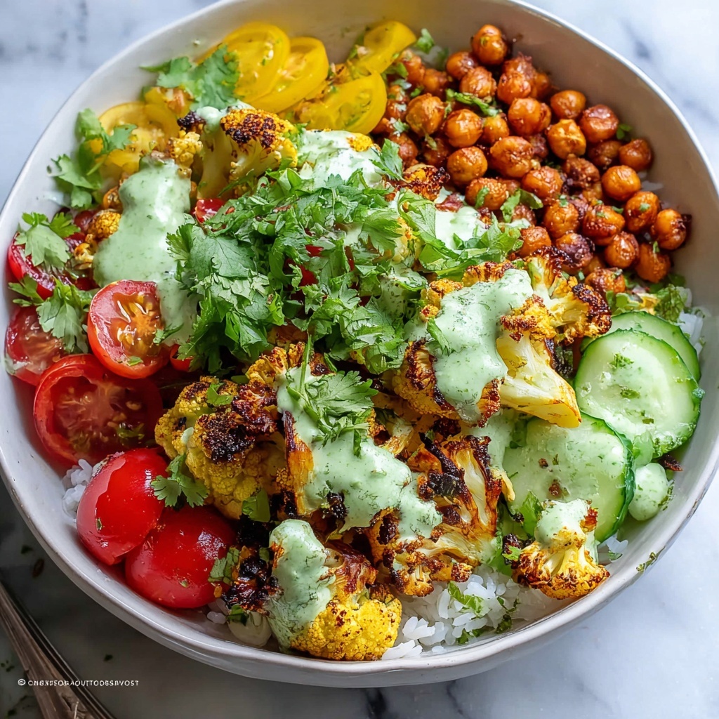 Complement your bowls with light, refreshing sides such as cucumber-tomato salad dressed in lemon and olive oil, or a simple tabbouleh. A dollop of creamy yogurt or tzatziki alongside adds coolness that beautifully contrasts the warm, spice-laden cauliflower and chickpeas.