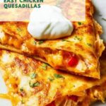This Chicken Quesadillas recipe is a flavorful, quick, and easy meal featuring tender chicken, sautéed vegetables, and melted Mexican cheese blend all folded into crispy golden tortillas. Perfect for a weeknight dinner or entertaining, these quesadillas come with classic toppings like sour cream, salsa, guacamole, jalapeños, and fresh cilantro to enhance the taste.