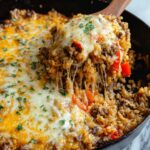 This Chicken Fajita Rice Skillet is a flavorful, one-pan meal featuring tender chicken thighs, sautéed bell peppers, and onions, all cooked together with fragrant spices, creamy broth, and melted cheddar cheese for a comforting Tex-Mex inspired dinner that’s easy to prepare and perfect for weeknights.