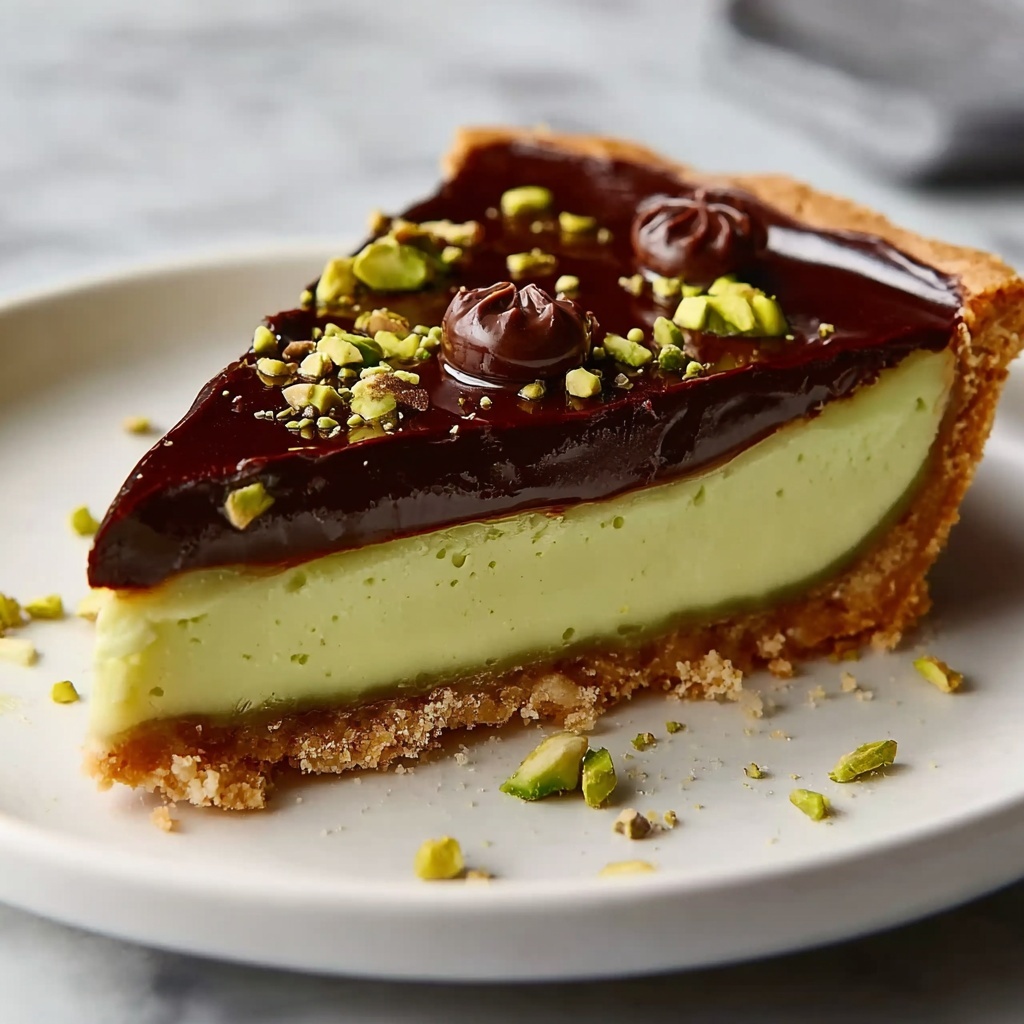 This rich and decadent Chocolate Pistachio Ganache Tart features a crisp cocoa tart shell filled with smooth dark chocolate ganache, topped with a luscious pistachio cream layer, and finished with a glossy chocolate ganache crown. Garnished with crunchy roasted pistachios, this elegant dessert balances nutty flavors and silky textures perfect for special occasions or indulgent treats.
