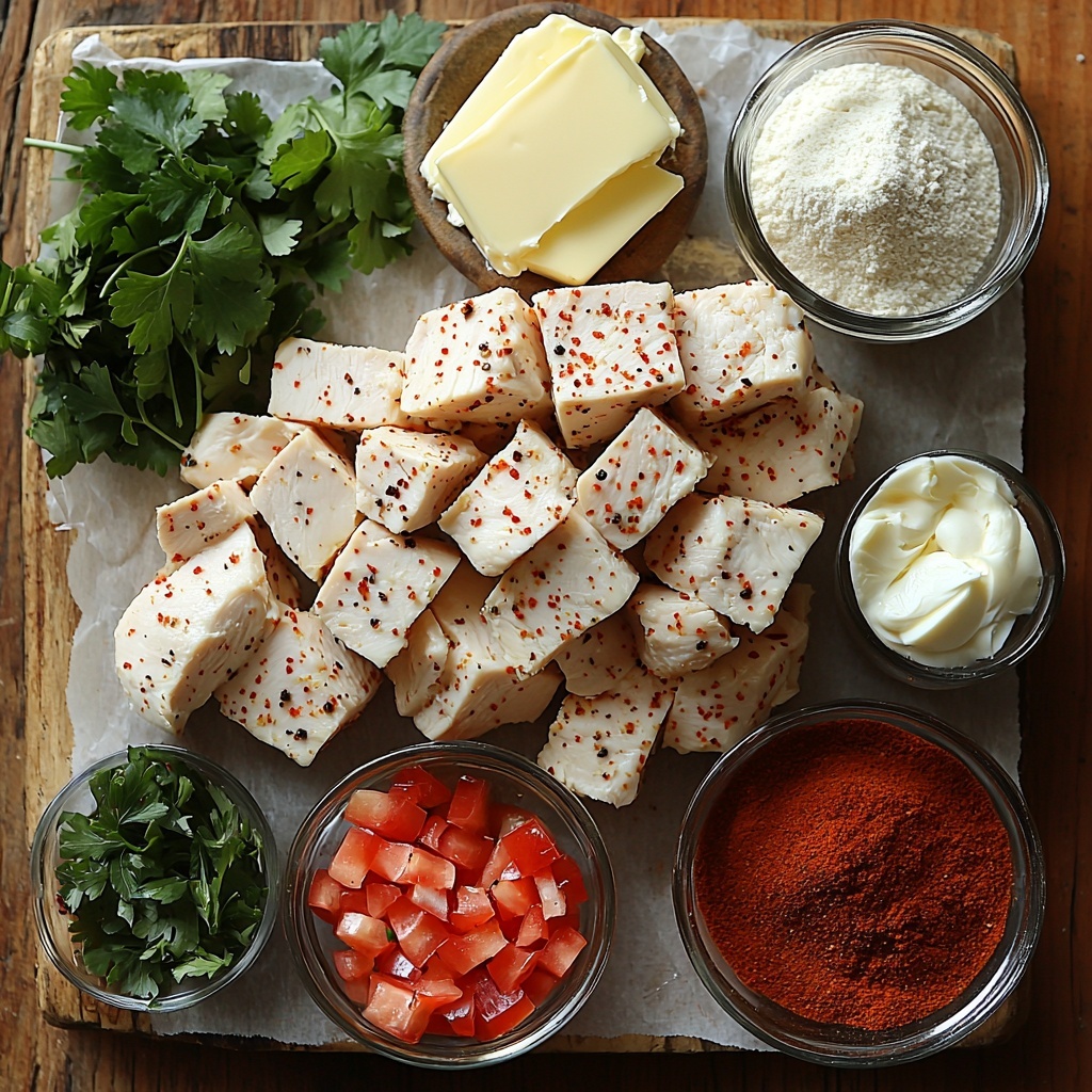 - Season Chicken: Dice chicken breasts into bite-sized cubes and toss them in paprika, onion powder, salt, and black pepper to evenly coat the meat with flavor.