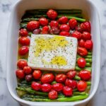 1. Preheat and Prepare Vegetables: Preheat the oven to 400ËšF. In a 9×13 inch casserole dish, combine the tomatoes and asparagus. Add 1/3 cup olive oil, 2 minced garlic cloves, 1/2 tsp black pepper, and 1/4 tsp salt. Toss everything together well. Create a space in the center of the pan and place the 8 oz block of feta cheese. Drizzle 1 Tbsp olive oil over the cheese and sprinkle a bit more black pepper on top. Place in the oven.