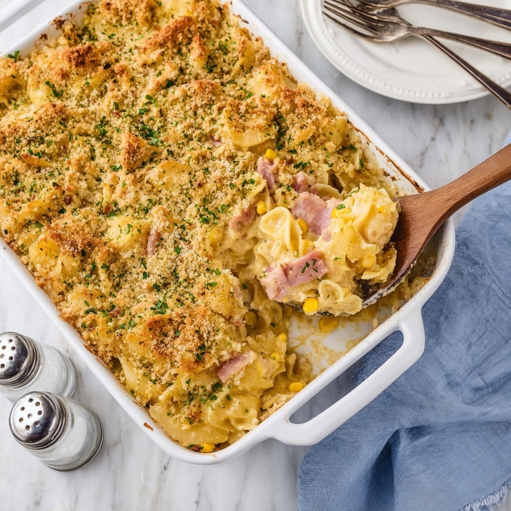 How to Make Creamy Ham Noodle Casserole with Cheddar, Parmesan, and Panko Breadcrumb Topping Recipe