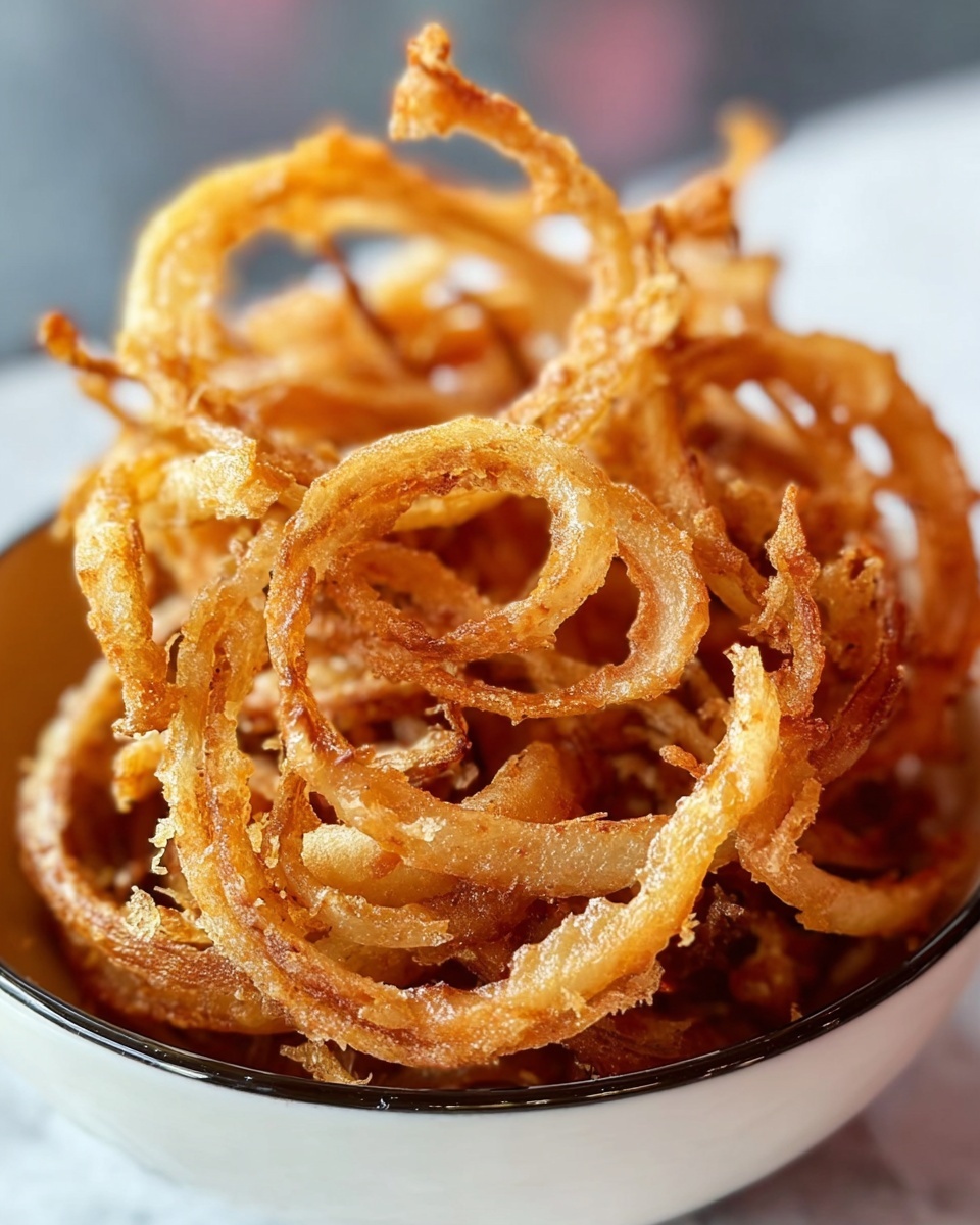 Serve these hot and fresh. Whether piled atop burgers, nestled beside a juicy steak, or enjoyed as a snack with your favorite dipping sauce, these crispy onion strings bring an addictive crunch and bold flavor that’s simply unforgettable.