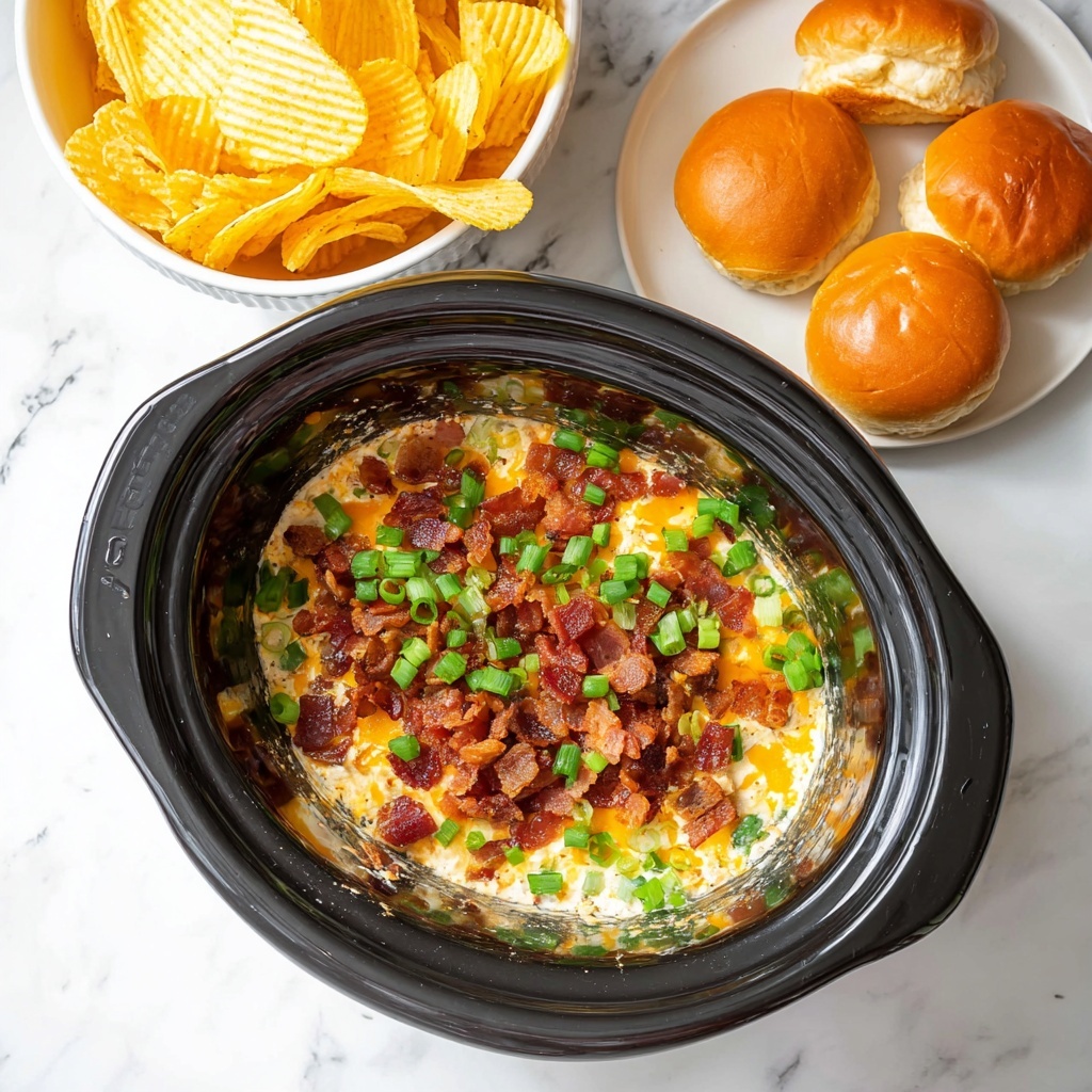 - Add Toppings: Sprinkle the shredded cheddar cheese, crumbled cooked bacon, and sliced scallions evenly over the chicken mixture in the crockpot.