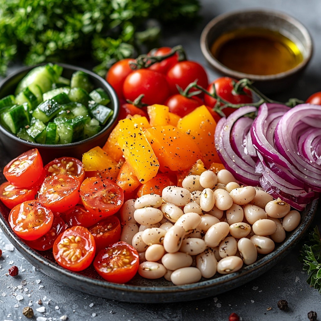 Start by draining and rinsing the white beans thoroughly to remove any excess sodium and liquid from the can. This also helps the beans keep their texture intact. Next, thinly slice the red onion and the three bell peppers into delicate strips that offer a satisfying crunch in every bite. Halve the cherry tomatoes or chop the roasted red peppers if you prefer a smoky twist. Finally, finely chop the fresh parsley to sprinkle throughout the salad.