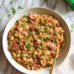 While your veggies are cooking, chop the andouille sausage into bite-sized pieces. This step is simple but vital because the sausage will infuse the whole dish with its delightful smoky essence.