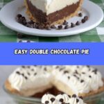 This Double Chocolate Pie is a rich and decadent dessert featuring a perfectly baked cocoa-infused filling in a buttery pre-made pie crust, finished with white chocolate Ghirardelli wafers for an added touch of sweetness and texture.