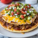 - Assemble the Pizzas: Spread a layer of refried beans onto each fried tortilla. Top with a generous amount of the seasoned beef, followed by shredded Colby Jack cheese and then another tortilla on top. Add taco sauce and sprinkle more cheese over the top tortilla layer.
