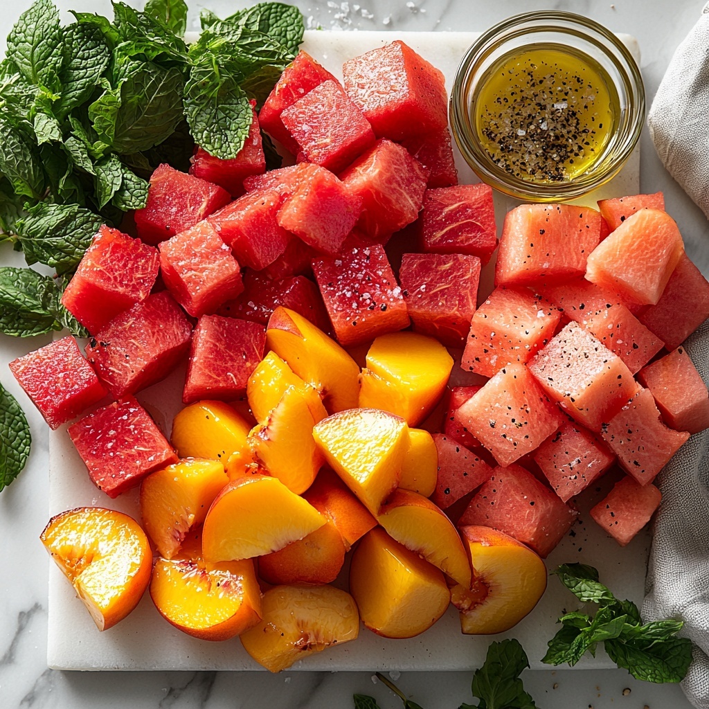 A refreshing and light summer salad combining sweet ripe peaches and juicy watermelon, enhanced with fresh mint, a hint of citrus, and a touch of seasoning. Perfect for a quick, healthy, no-cook dish ideal for warm days.