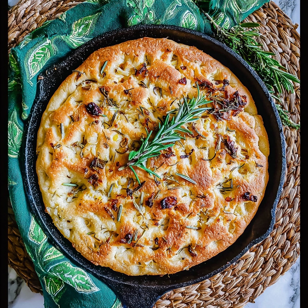 Take your Garlic and Rosemary Skillet Bread Recipe up a notch by serving it with a selection of dips like whipped feta, roasted red pepper hummus, or balsamic-infused olive oil. Slice it into thick wedges and make open-faced mini sandwiches with prosciutto and fresh mozzarella for a party-ready appetizer. Alternatively, transform it into garlic bread by re-heating with extra garlic butter and a sprinkle of Parmesan cheese.