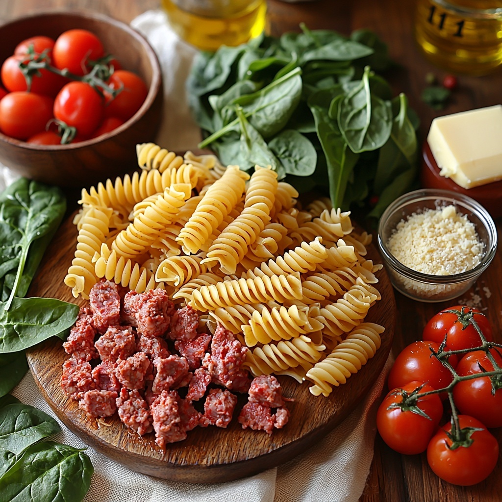 Garlic Butter Rotini with Beef, Italian Sausage, and Spinach Recipe