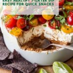 Finish the Healthy 7-Layer Dip Recipe by sprinkling diced cherry tomatoes and chopped cilantro over the top. These colorful, fresh ingredients bring brightness, a juicy crunch, and herbal notes that elevate the entire dip experience.