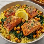 This Healthy Salmon & Chickpea Couscous Bowl is a vibrant, nutritious meal combining perfectly seasoned pan-seared or oven-baked salmon with a flavorful whole-wheat couscous salad loaded with chickpeas, fresh vegetables, and herbs. Finished with a creamy yogurt-tahini drizzle, this recipe offers a balanced combination of protein, fiber, and fresh Mediterranean flavors making it ideal for a wholesome lunch or dinner.