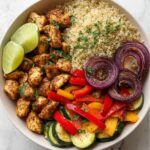 A wholesome and flavorful meal featuring spicy roasted chicken paired with a medley of roasted vegetables, served over a nutritious base of quinoa or brown rice. This healthy bowl offers a perfect balance of protein, vegetables, and grains, enhanced with aromatic spices and fresh lime for a vibrant, satisfying dish.