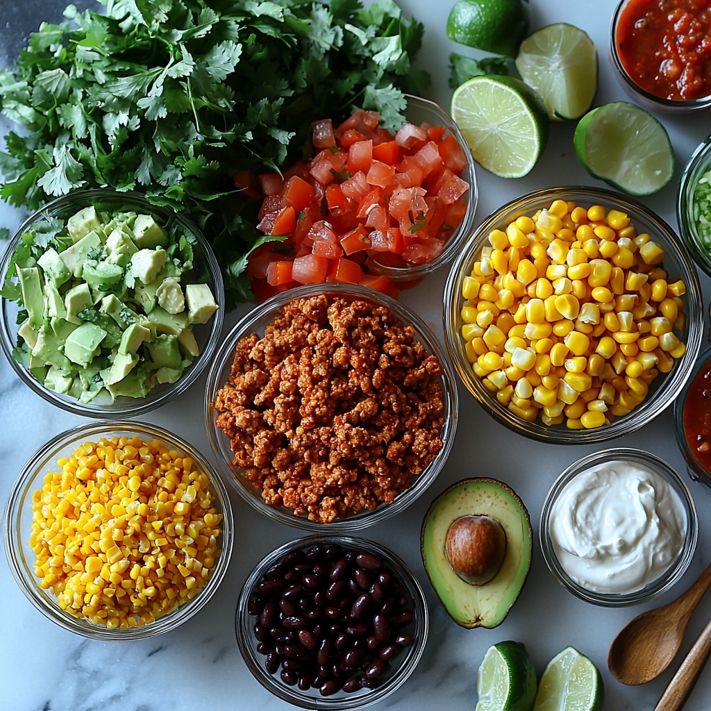 - Assemble the Bowl: Layer the cooked rice at the bottom of each bowl. Add a layer of chopped lettuce, followed by the seasoned ground turkey. Top with warmed corn and black beans. Garnish with sliced avocado or guacamole, salsa, a dollop of light Greek yogurt, chopped fresh cilantro, and lime wedges to squeeze over before eating.