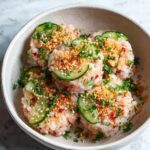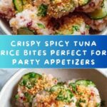 Once the rice squares have cooled slightly but remain crispy, spoon a generous portion of the spicy tuna mixture onto each one. Garnish with sesame seeds, chopped chives, and if you’re feeling indulgent, a delicate slice of avocado to add softness and a buttery texture that complements the spicy tuna perfectly. Serve immediately to enjoy the perfect contrast between crunchy rice and luscious topping.