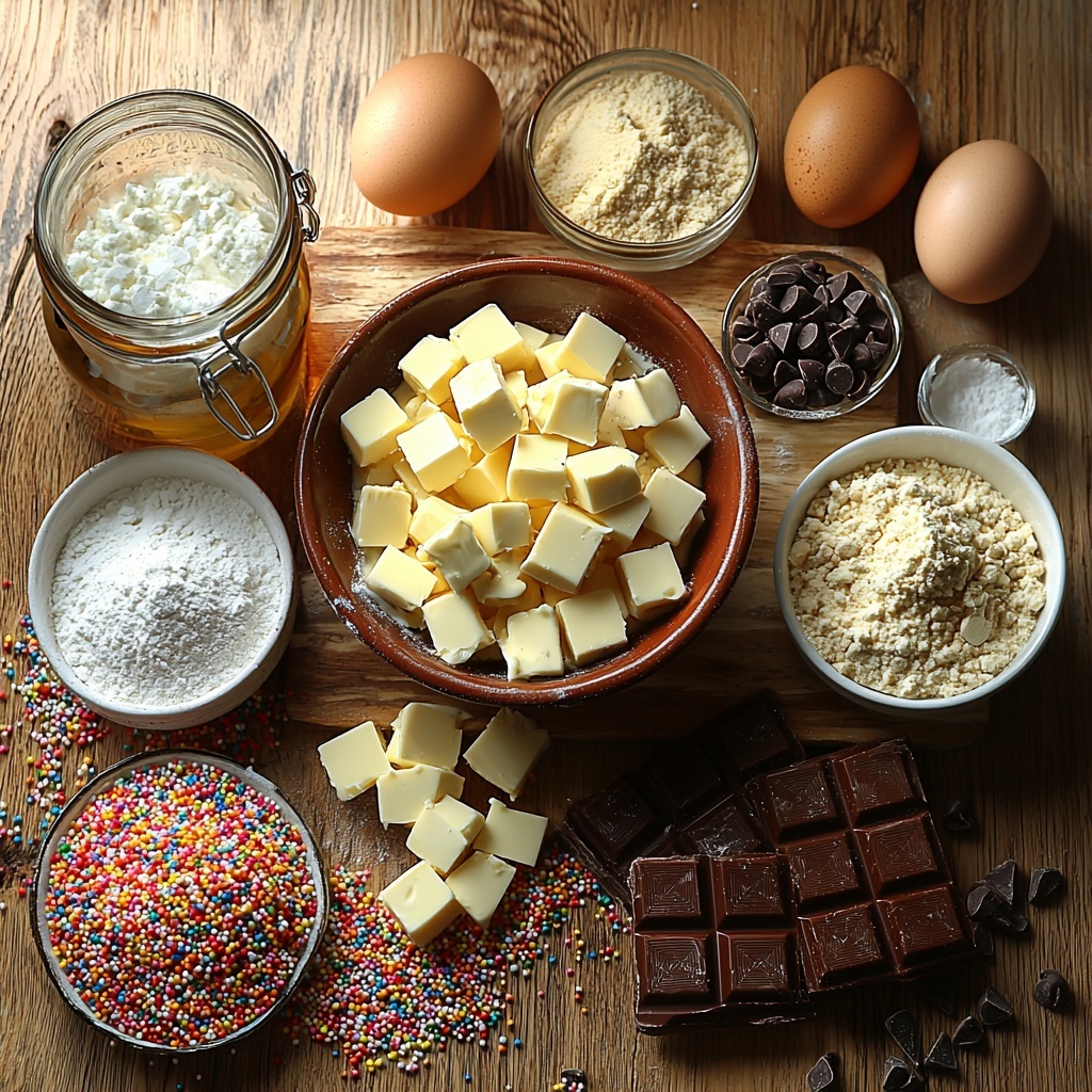 The magic in this Indulgent Chocolate Chip Cookie Cake Recipe starts with simple, pantry-friendly ingredients that come together to create that perfect balance of flavor and texture. Each component plays a crucial role—from the tender crumb to the gooey chocolate pockets and the creamy frosting on top.
