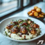 This Indulgent Hot Honey Balsamic Chicken Alfredo with Whipped Feta is a deliciously creamy and flavorful pasta dish featuring tender chicken glazed in a sweet and spicy hot honey balsamic sauce, served over silky fettuccine tossed in rich Alfredo sauce, and topped with a unique whipped feta cheese and crispy roasted Brussels sprouts for added texture and brightness.