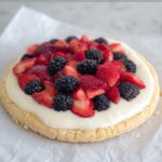 - Assemble the Pizza: Spread the lemon-zested yogurt evenly over the cooled cookie crust. Arrange the blackberries and sliced strawberries on top decoratively.