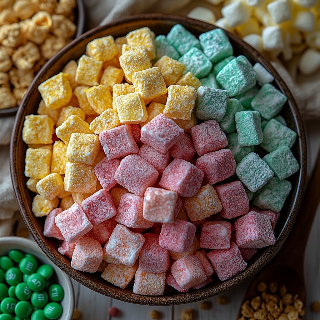 Gathering the right ingredients is simple but key to achieving the perfect harmony of taste and texture in this Leprechaun Bait Recipe. Each component contributes something special, from the sweet crunch of cereals to the gooey softness of marshmallows, plus a pop of green color that makes it festive and fun.