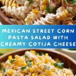 A vibrant and creamy Mexican Street Corn Pasta Salad combining rotini pasta with charred corn, a zesty mayo and sour cream dressing, tangy cotija cheese, fresh cilantro, and a hint of jalapeño for a perfect summer side dish or light vegetarian meal.