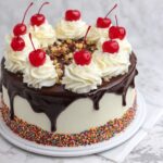This cake looks divine topped with a handful of maraschino cherries, which add a pop of color and a sweet, fruity bite that complements the layered flavors beautifully. Fresh berries or edible flowers can also add an elegant touch and a fresh brightness.