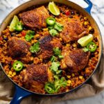 A flavorful and hearty One Pot Mexican Chicken and Rice recipe featuring tender marinated chicken thighs with a smoky, spicy Mexican spice blend, cooked together with rice, beans, corn, and tomato passata to create a comforting and easy-to-make meal perfect for family dinners.