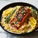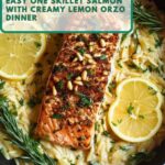 This One Skillet Salmon with Lemon Orzo recipe features tender, perfectly seared salmon fillets served atop a creamy and zesty lemon-infused orzo. The salmon is seasoned with a simple blend of salt, pepper, garlic, and oregano, then seared and finished in the oven for juicy, flaky results. The orzo is cooked separately and combined with chicken broth, heavy cream, fresh lemon juice, and parsley to create a luscious side that complements the rich fish. Ideal for an easy yet elegant weeknight dinner.