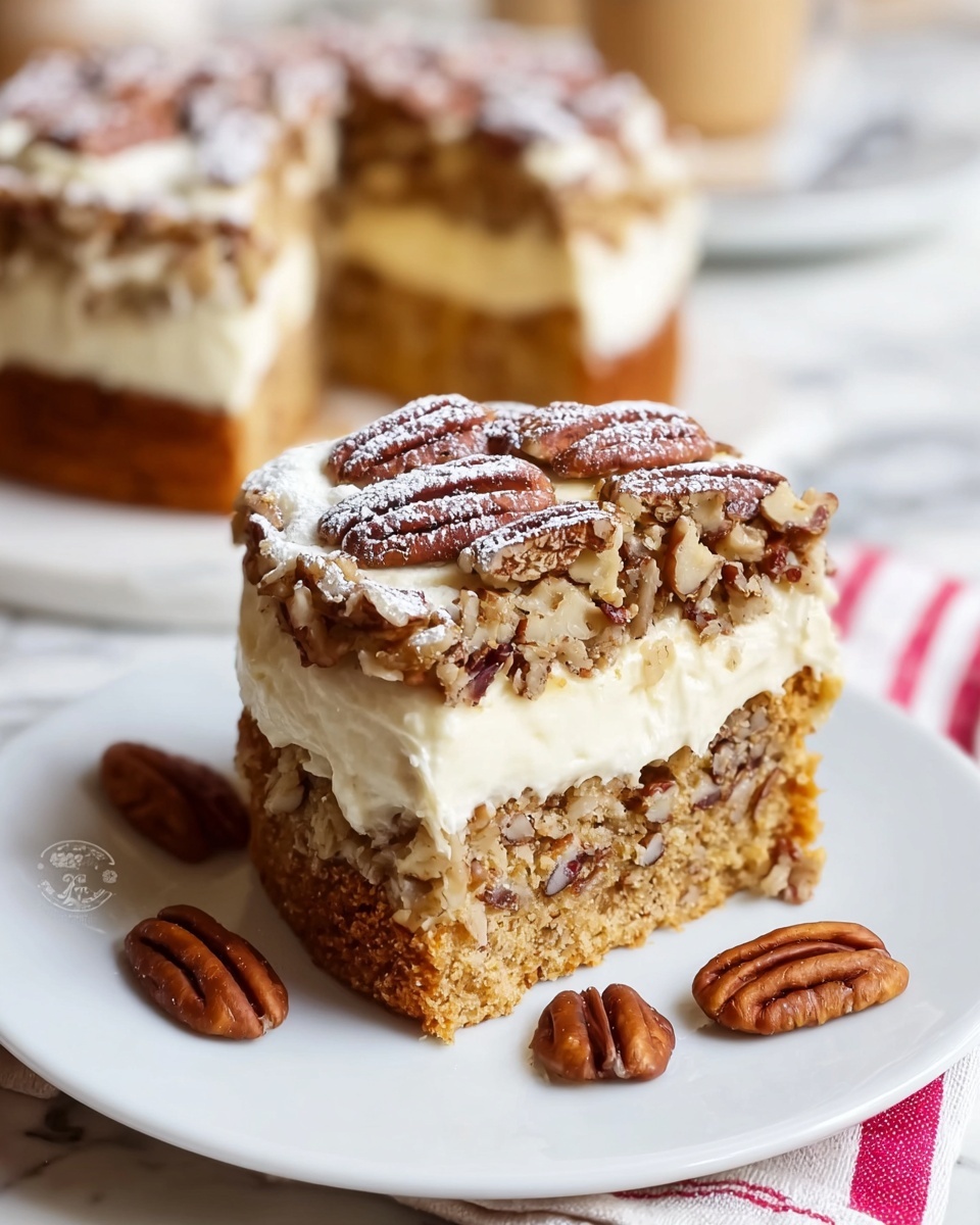 A classic way to dress up your slices is with a dollop of fresh whipped cream or a scoop of creamy vanilla ice cream. These add a cool, airy contrast that balances the rich, nutty sweetness of the Pecan Pie Cake Recipe beautifully. For a little extra flair, sprinkle some toasted pecans or a dusting of powdered sugar on top.