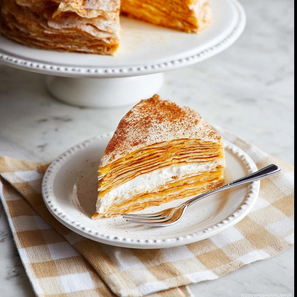 To make your Pumpkin Crepe Cake Recipe feel even more festive, consider topping it with a sprinkle of cinnamon, a dusting of powdered sugar, or some toasted pecans for crunch. A few fresh cranberries or a dollop of whipped cream can brighten the look and add an extra burst of flavor.