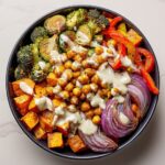 A wholesome and vibrant Roasted Chickpea & Veggie Bowl featuring crispy roasted broccoli, Brussels sprouts, sweet potatoes, and chickpeas, all tossed in a zesty tahini-mustard dressing. Perfect for a nutritious and satisfying meal that’s easy to prepare and packed with flavor.