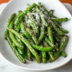 A simple and delicious recipe for roasted green beans coated in olive oil, seasoned with garlic and spices, and topped with melted Parmesan cheese and a fresh lemon juice drizzle. Perfect as a crispy, flavorful side dish.