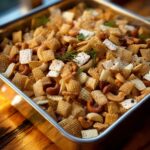 This Roasting Pan Chex Mix recipe delivers a crunchy, savory snack mix perfect for parties or casual nibbling. Combining Corn and Rice Chex cereals with pretzels, bagel chips, peanuts, and cashews, all coated in a flavorful buttery Worcestershire seasoning, then slow-roasted to a perfect crisp in the oven. It’s an easy-to-make snack with a great balance of salty, garlicky, and nutty flavors that everyone will enjoy.