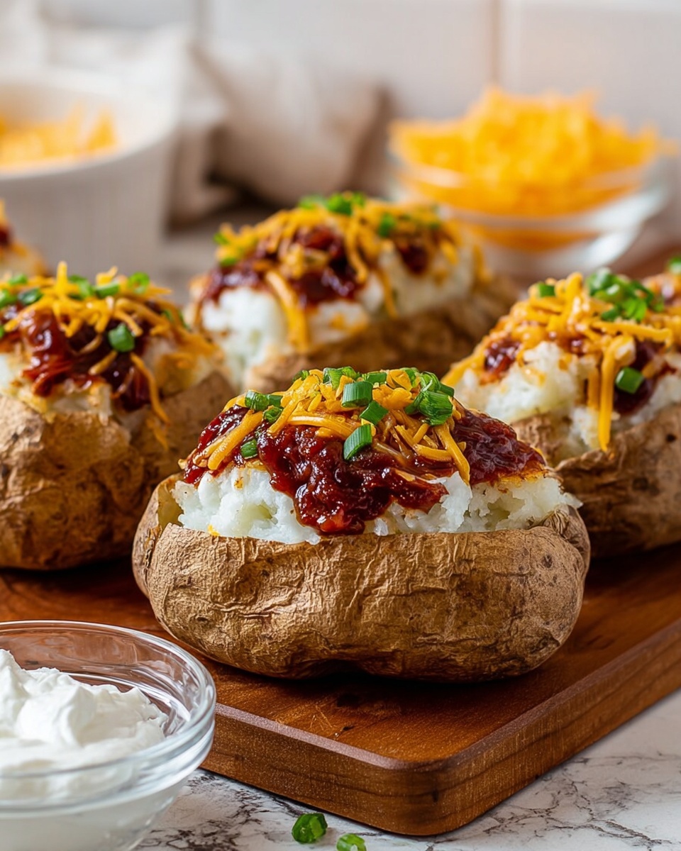 Slice each baked potato lengthwise and gently fluff the insides with a fork to create a pillow for the toppings. Pile on a generous scoop of BBQ chicken, sprinkle with cheddar cheese, then pop them under the broiler for just a couple of minutes for that melty, bubbly cheesy finish. Top with sour cream, green onions, and if you like, some crispy bacon or pickled jalapeños for an extra kick.