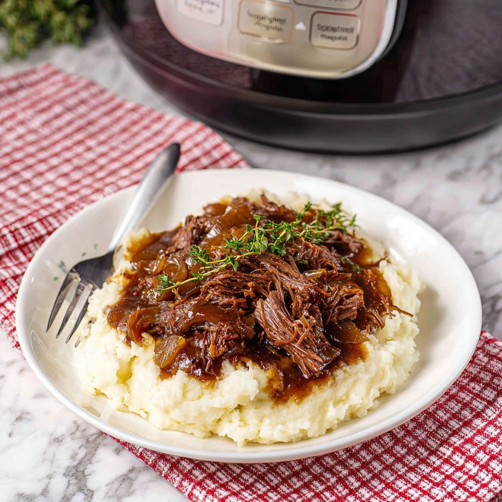 This pot roast pairs wonderfully with creamy mashed potatoes, buttered egg noodles, or crusty artisan bread to soak up every bit of that rich oniony gravy. Roasted root vegetables or a simple green salad add balance and color for a well-rounded meal.