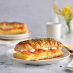 - Assemble Mille-feuille: Spread crème fraîche on the bottom layer of each pastry piece, add a layer of scrambled eggs, then top with smoked salmon and a sprinkle of chopped chives. Finish by placing the top pastry layer over the filling. Garnish with extra chives and additional crème fraîche if desired.