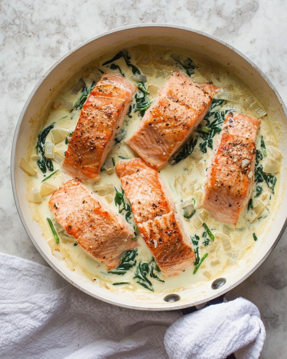 Fresh herbs like chopped parsley or dill add a pop of color and a fresh burst of flavor on top of this creamy salmon dish. A light squeeze of lemon over the finished plate brightens the entire meal, cutting through some of the richness and enhancing all the ingredients’ natural flavors.
