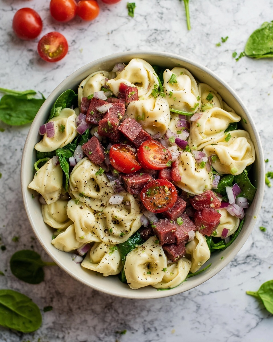 - 8 ounces salami, chopped: Adds a savory, slightly spicy punch and a meaty bite that complements the tortellini.