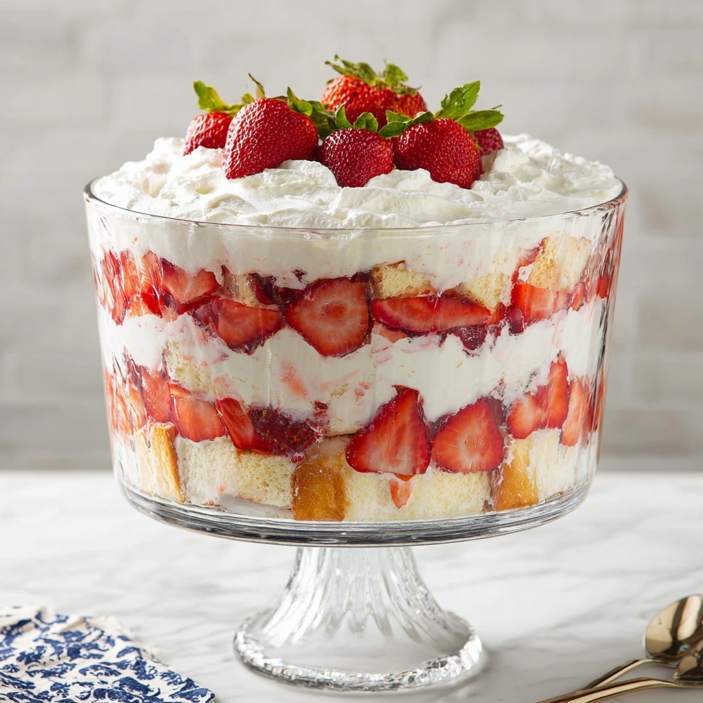 - Assemble the Trifle: In a large clear trifle bowl or individual serving glasses, layer a portion of cubed angel food cake at the bottom. Spoon a layer of the macerated strawberries over the cake, then add a generous layer of whipped cream. Repeat these layers until all ingredients are used, finishing with a top layer of whipped cream and a few whole or sliced strawberries for garnish.