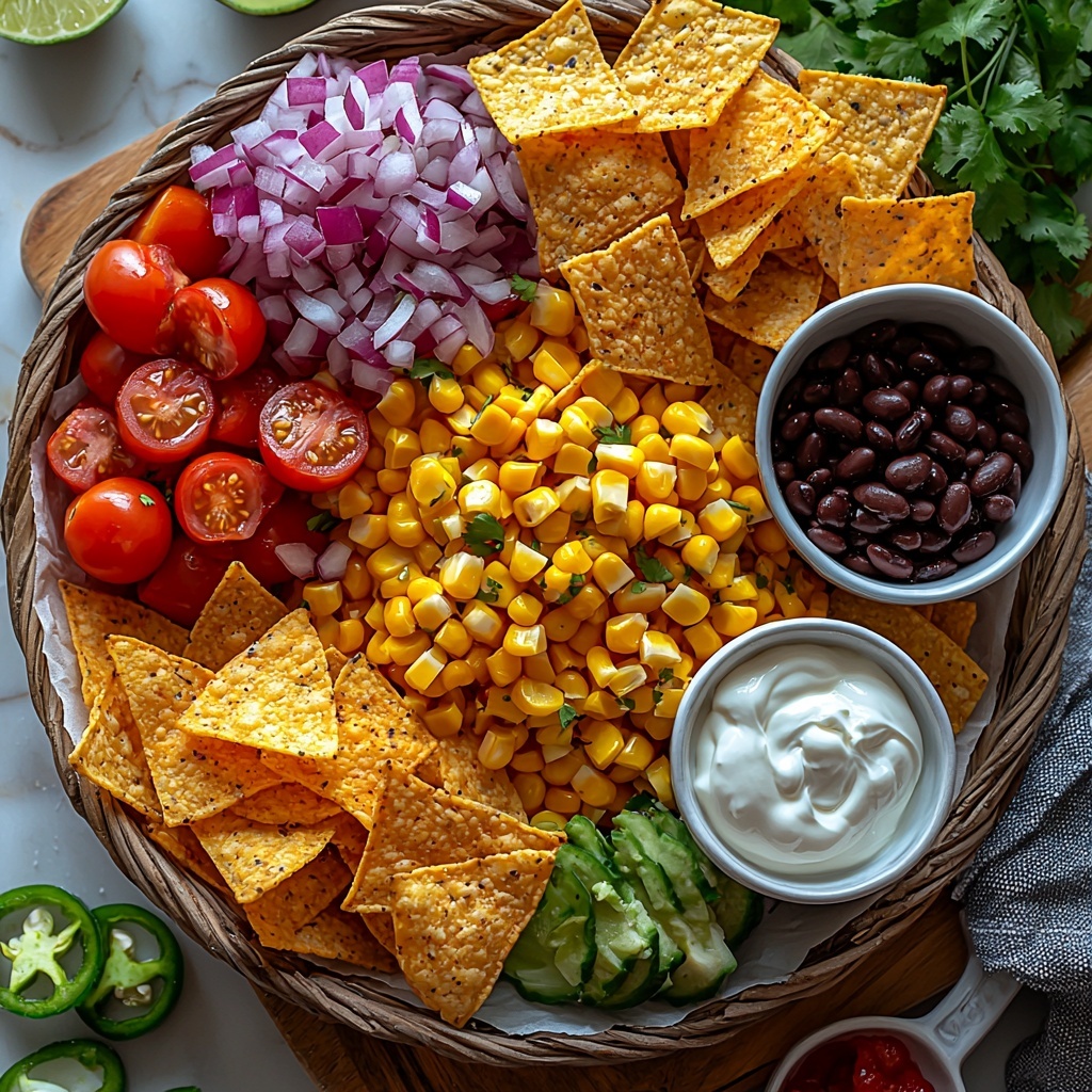 On a large platter or baking sheet, spread a single layer of tortilla chips to act as the crunchy base. Top with half of the roasted corn, black beans, diced tomatoes, onions, and drizzle some creamy sauce over everything. This layering will ensure every bite is bursting with flavor.