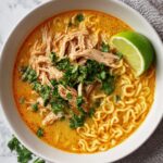 Finally, stir in your cooked shredded chicken or tofu, letting it warm through for about 5 minutes. Just before serving, add the fresh lime juice to brighten the soup and balance the luscious creaminess. Taste and adjust the seasoning, adding a pinch more soy sauce, lime juice, or curry paste if you want more saltiness, acidity, or heat.