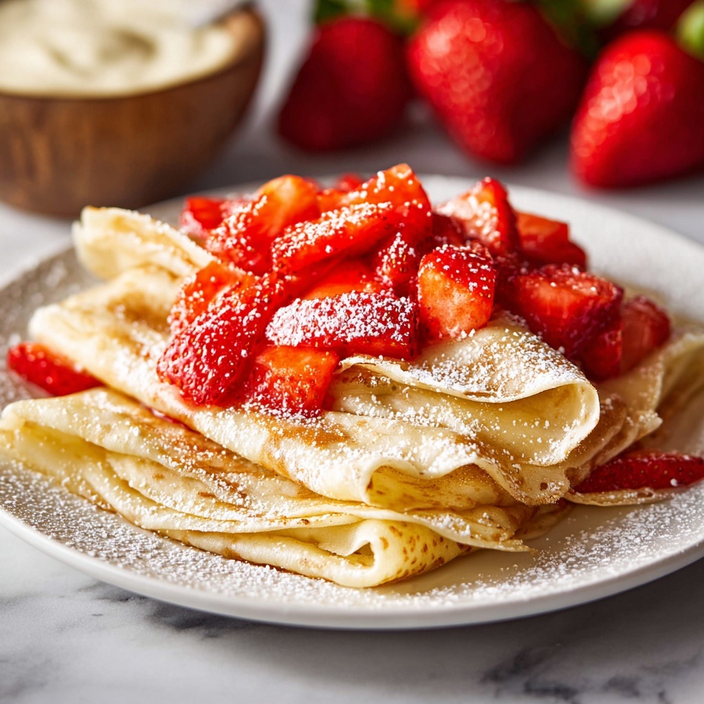 Start by washing and hulling your strawberries. Slice or quarter them depending on your preference, then place in a serving bowl. Add granulated sugar and strawberry jam, mixing gently. Letting the berries macerate for about 20 minutes creates an irresistible juicy topping that adds a fresh burst of flavor to each crepe.