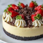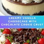 This Vanilla Cheesecake with Chocolate Crust features a rich and creamy vanilla filling atop a crunchy chocolate cookie crust. Baked to perfection, it is topped with light whipped cream, chocolate shavings, and fresh strawberries, making it an elegant and indulgent dessert perfect for any occasion.