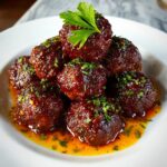 Whiskey Peach BBQ Meatballs feature tender baked meatballs made from ground beef or pork, seasoned with aromatic spices and fresh parsley, coated in a luscious, slightly sweet and smoky whiskey peach BBQ sauce. Perfect as a crowd-pleasing appetizer or served over rice for a flavorful main course that combines savory, fruity, and tangy notes in every bite.